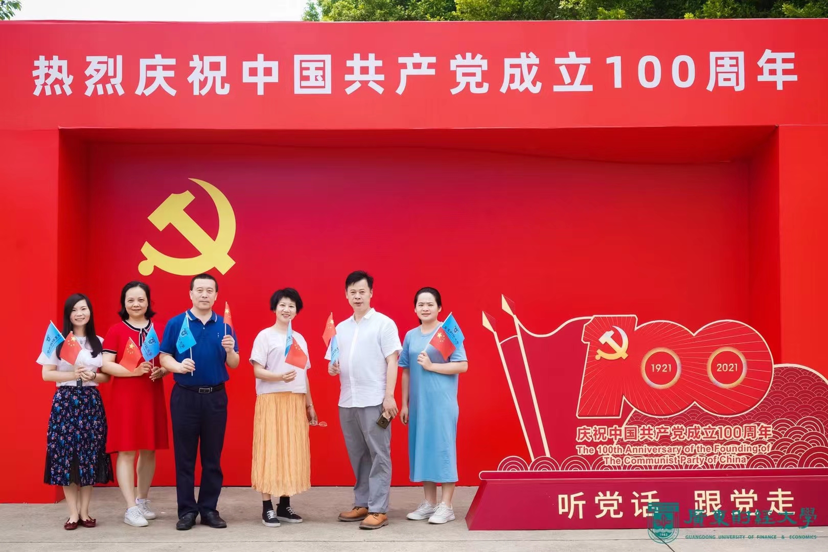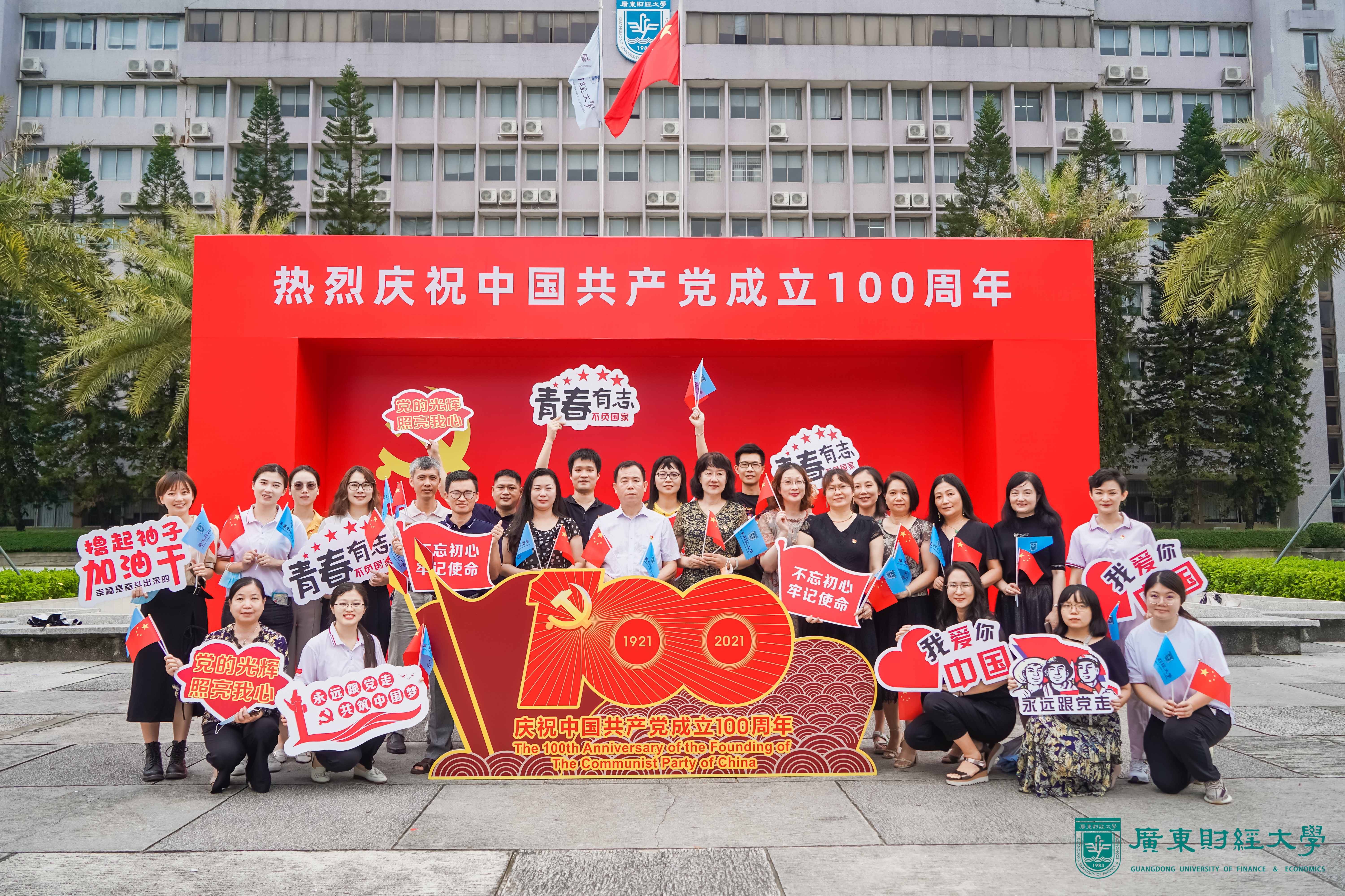 在中国共产党成立100周年来临之际,学校举办了“我和党旗合个影”主题活动。6月28日上午,财务与国有资产管理处全体教职工分别在广州校区与佛山校区广场与党旗进行拍照合影。